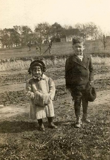 Pictured are Velva Violetta Domke and Foreman Robert Davis. Velva was the daughter of Gertrude Davis and Emil Domke. Foreman was the son of Benjamin Johnson Davis and Emma Rachel (Hendricks) Davis. Velva was born in Lowell 1909. Foreman Robert Davis was born in 1906 in Lowell. The picture was taken in Lowell near their house on 345 Castle Ave., ca. 1913.