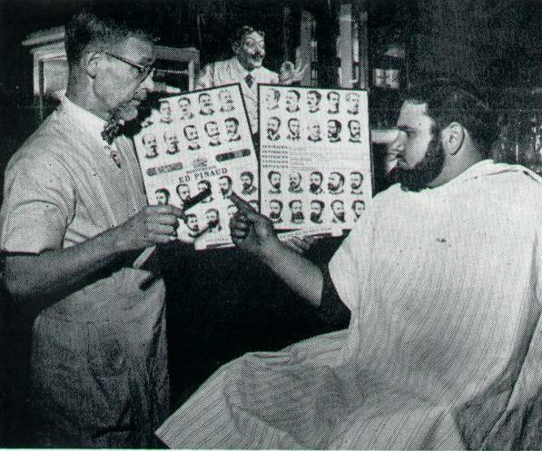 This 1952 photo of barber Fremond McCarty and Thomas Combs was taken during the Lowell Centennial celebration year.