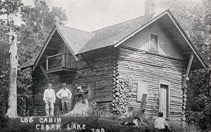 The Log Huntsman's Lodge, built in 1869 on the north bluff of Cedar Lake, was a retreat for the wealthy, offering food and lodging for hunters and others seeking fresh air and a nature retreat.