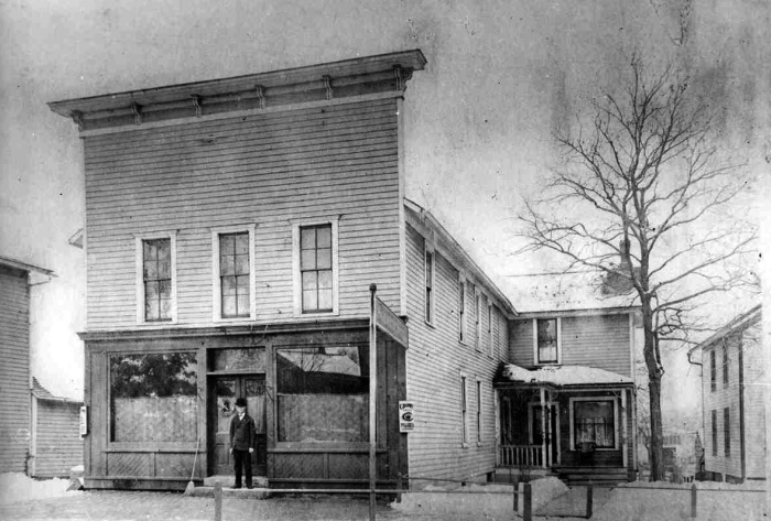 Taken after a snowstorm, this 1910 photo of the hotel shows the high, square facade of the building. The wing to the right in the rear, with porch, was part of the original building but was used as a school for a short time before 1860. Fred Schmal, hotel owner, is shown standing in the doorway.