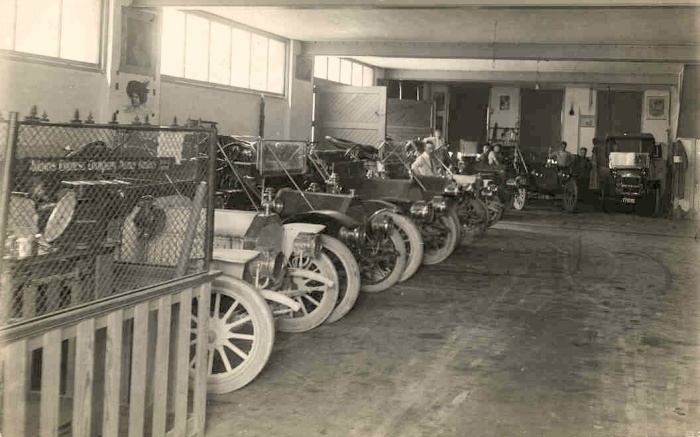 Information written on the back of this old-time picture postcard: "Lowell Garage -- Now (1995) a part of the Lowell Tribune office on Clark St."