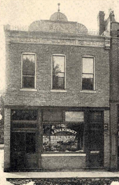 The artist shows the building as it now looks across the street. It is owned by Mr. John A. Kimmet, father of the present occupant, in which she displays her extensive stock in all modern and best styles of ladies' hats.