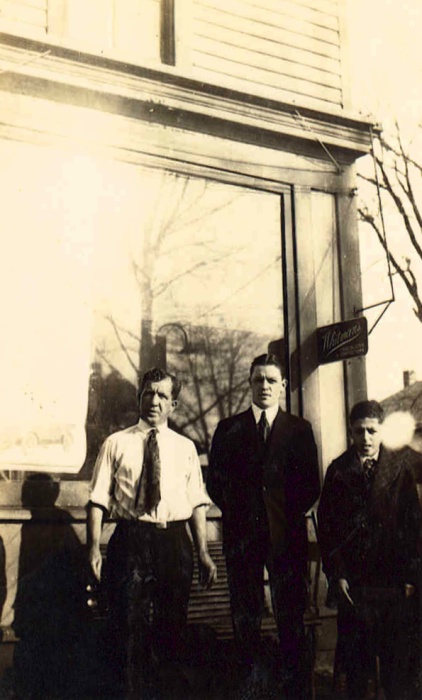 From left to right are Henry Heiser, owner of the Heiser Hotel, and his sons Arthur Leo and Florian John. This was taken in front of the hotel.