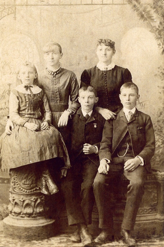 In the back is Emma on the left, Bessie is on the back right, Alice is seated next to her brothers, George (middle) and Ernest.